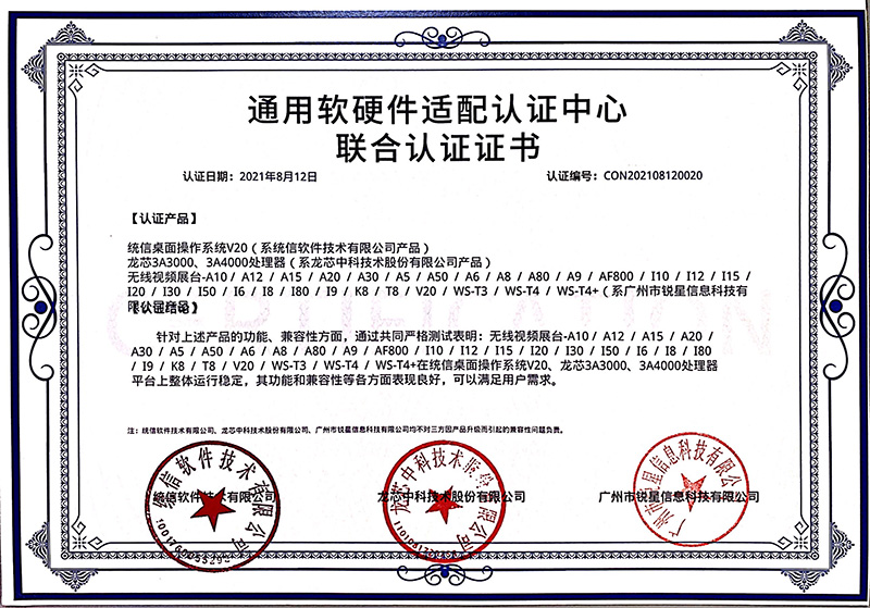 日前,由吉星子公司銳星信息科技自主研發(fā)的無線展臺系列產(chǎn)品與統(tǒng)信UOS桌面操作系統(tǒng)V20完成產(chǎn)品兼容性測試以及產(chǎn)品功能性測試。