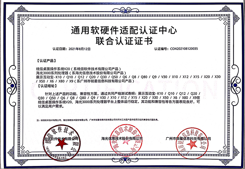 海光認(rèn)證證書(無線視頻展臺、視頻采集互動(dòng)終端)