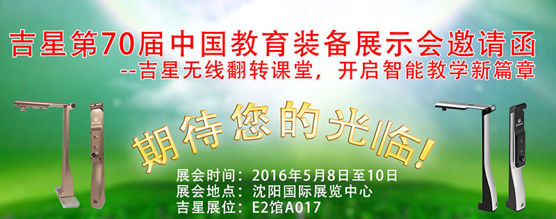第70屆中國教育裝備展示會將于2016年5月8日至10日在沈陽國際展覽中心隆重舉行,誠邀各位蒞臨吉星展位參觀指導!我司展位:E1號館,展位號A017 。