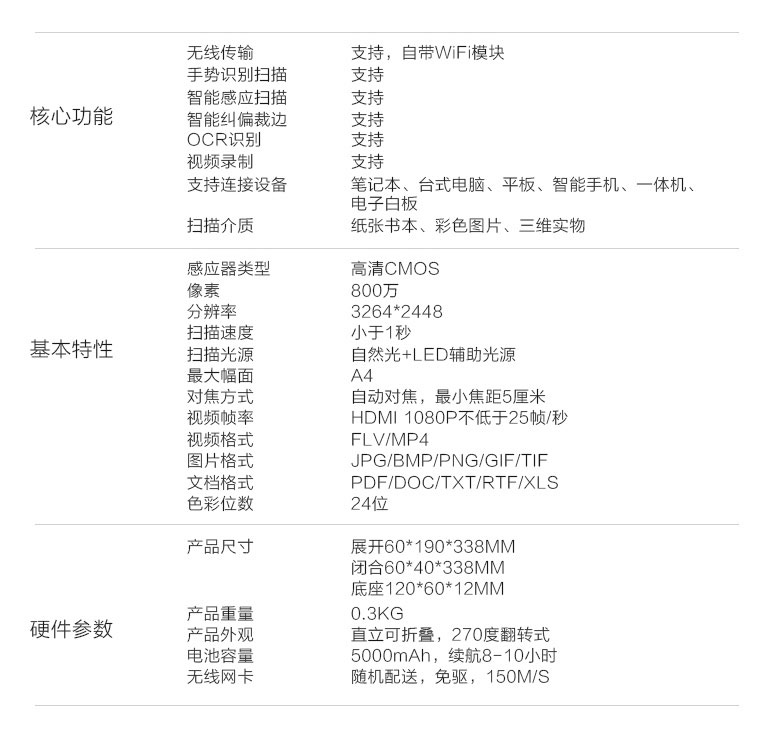 核心功能 無線傳輸、手勢(shì)識(shí)別掃描、智能感應(yīng)掃描、智能糾偏裁邊、OCR識(shí)別、視頻錄制等